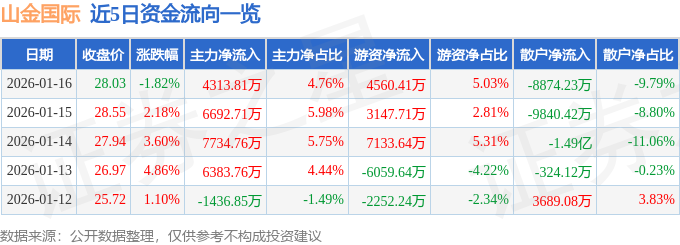 证券之星消息,截至2026年1月16日收盘,山金国际(000975)报收于28.03元,下跌1.82%,换手率1.27%,成交量31.97万手,成交额9.07亿元。