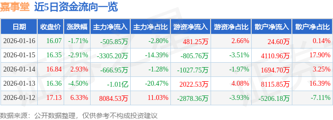 证券之星消息,截至2026年1月16日收盘,嘉事堂(002462)报收于16.07元,下跌1.71%,换手率3.85%,成交量11.22万手,成交额1.81亿元。