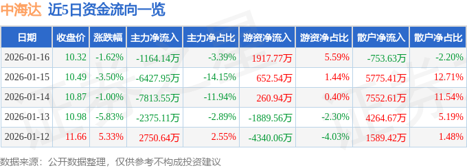 1月16日的资金流向数据方面,主力资金净流出1164.14万元,占总成交额3.39%,游资资金净流入1917.77万元,占总成交额5.59%,散户资金净流出753.63万元,占总成交额2.2%。