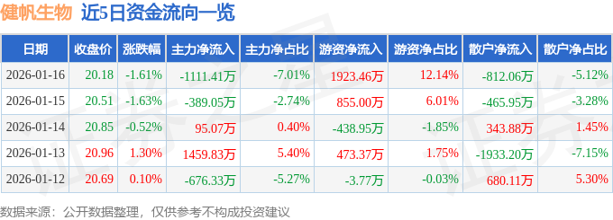 证券之星消息,截至2026年1月16日收盘,健帆生物(300529)报收于20.18元,下跌1.61%,换手率1.53%,成交量7.82万手,成交额1.58亿元。