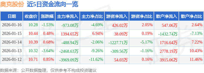 证券之星消息,截至2026年1月16日收盘,奥克股份(300082)报收于10.28元,下跌1.53%,换手率2.97%,成交量20.12万手,成交额2.07亿元。