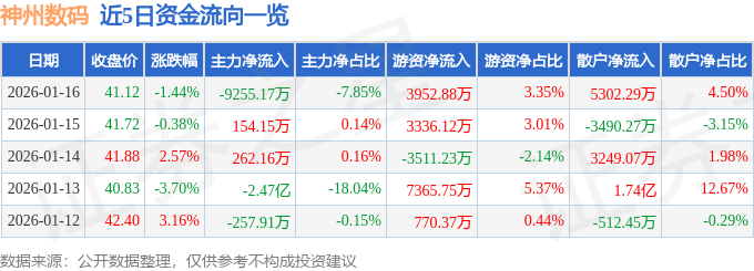 证券之星消息,截至2026年1月16日收盘,神州数码(000034)报收于41.12元,下跌1.44%,换手率4.75%,成交量28.74万手,成交额11.79亿元。