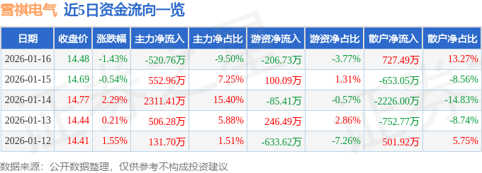 证券之星消息,截至2026年1月16日收盘,雪祺电气(001387)报收于14.48元,下跌1.43%,换手率3.31%,成交量3.77万手,成交额5482.65万元。