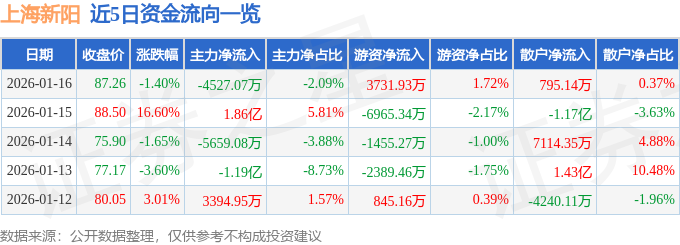 证券之星消息,截至2026年1月16日收盘,上海新阳(300236)报收于87.26元,下跌1.4%,换手率8.89%,成交量24.77万手,成交额21.65亿元。