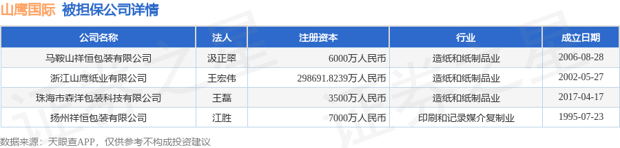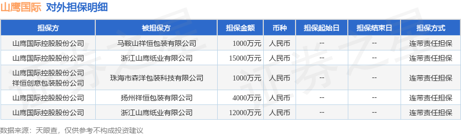 山鹰国际1月15日披露5笔对外担保,被担保公司4家。对外担保明细如下表: