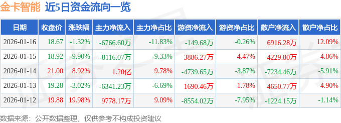 证券之星消息,截至2026年1月16日收盘,金卡智能(300349)报收于18.67元,下跌1.32%,换手率8.3%,成交量30.64万手,成交额5.72亿元。