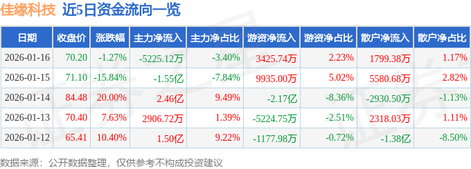 证券之星消息,截至2026年1月16日收盘,佳缘科技(301117)报收于70.2元,下跌1.27%,换手率27.01%,成交量21.46万手,成交额15.39亿元。