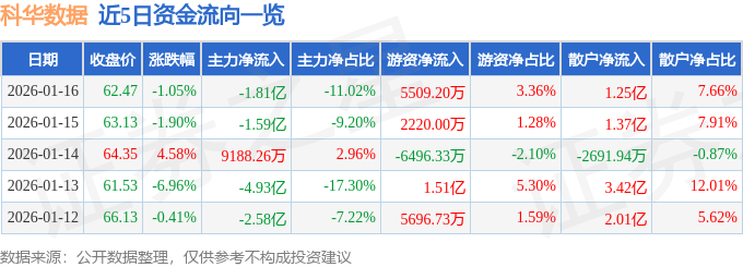 证券之星消息,截至2026年1月16日收盘,科华数据(002335)报收于62.47元,下跌1.05%,换手率5.75%,成交量26.16万手,成交额16.39亿元。