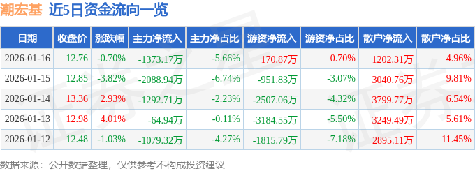 证券之星消息,截至2026年1月16日收盘,潮宏基(002345)报收于12.76元,下跌0.7%,换手率2.19%,成交量18.99万手,成交额2.42亿元。