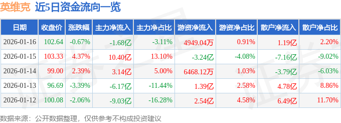 证券之星消息,截至2026年1月16日收盘,英维克(002837)报收于102.64元,下跌0.67%,换手率6.18%,成交量52.54万手,成交额54.11亿元。