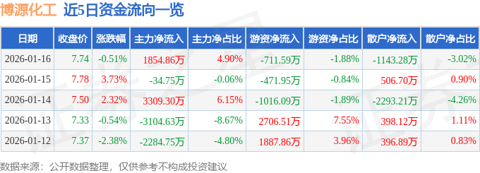 证券之星消息,截至2026年1月16日收盘,博源化工(000683)报收于7.74元,下跌0.51%,换手率1.46%,成交量48.99万手,成交额3.79亿元。
