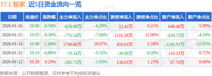 证券之星消息,截至2026年1月16日收盘,TCL智家(002668)报收于10.0元,下跌0.5%,换手率1.0%,成交量10.82万手,成交额1.08亿元。