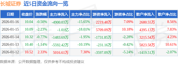 证券之星消息,截至2026年1月16日收盘,长城证券(002939)报收于10.04元,下跌0.5%,换手率0.86%,成交量31.08万手,成交额3.13亿元。