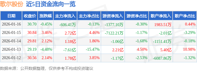 证券之星消息,截至2026年1月16日收盘,歌尔股份(002241)报收于30.7元,下跌0.45%,换手率4.71%,成交量147.73万手,成交额45.4亿元。