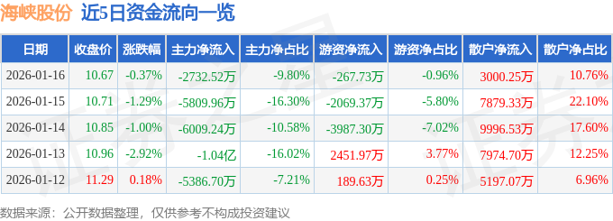 证券之星消息,截至2026年1月16日收盘,海峡股份(002320)报收于10.67元,下跌0.37%,换手率1.17%,成交量26.04万手,成交额2.79亿元。