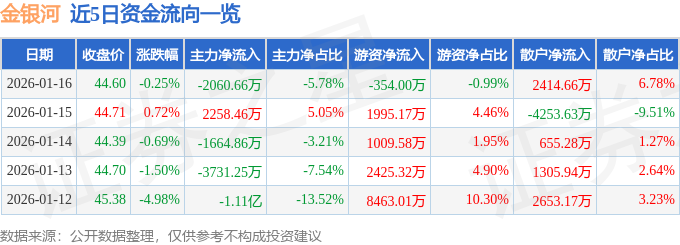 证券之星消息,截至2026年1月16日收盘,金银河(300619)报收于44.6元,下跌0.25%,换手率5.52%,成交量8.02万手,成交额3.56亿元。