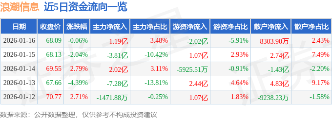 证券之星消息,截至2026年1月16日收盘,浪潮信息(000977)报收于68.09元,下跌0.06%,换手率3.43%,成交量50.26万手,成交额34.14亿元。