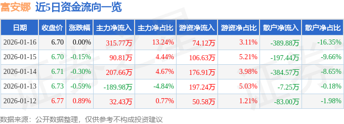 1月16日的资金流向数据方面,主力资金净流入315.77万元,占总成交额13.24%,游资资金净流入74.12万元,占总成交额3.11%,散户资金净流出389.88万元,占总成交额16.35%。