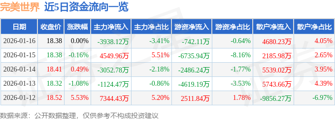 证券之星消息,截至2026年1月16日收盘,完美世界(002624)报收于18.38元,上涨0.0%,换手率3.48%,成交量63.63万手,成交额11.55亿元。