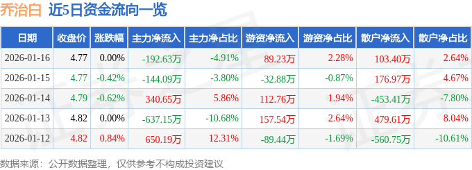 1月16日的资金流向数据方面,主力资金净流出192.63万元,占总成交额4.91%,游资资金净流入89.23万元,占总成交额2.28%,散户资金净流入103.4万元,占总成交额2.64%。