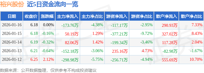 证券之星消息,截至2026年1月16日收盘,裕兴股份(300305)报收于6.18元,上涨0.0%,换手率2.01%,成交量6.47万手,成交额3970.16万元。