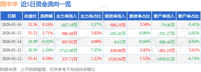 证券之星消息,截至2026年1月16日收盘,翔丰华(300890)报收于31.56元,上涨0.16%,换手率5.57%,成交量6.06万手,成交额1.91亿元。