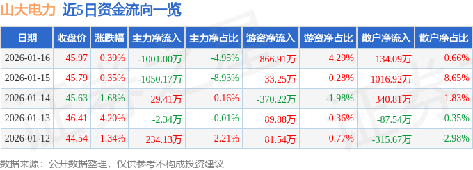 证券之星消息,截至2026年1月16日收盘,山大电力(301609)报收于45.97元,上涨0.39%,换手率12.36%,成交量4.29万手,成交额2.02亿元。