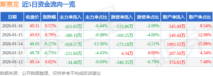 证券之星消息,截至2026年1月16日收盘,聚赛龙(301131)报收于49.31元,上涨0.57%,换手率4.24%,成交量1.31万手,成交额6390.42万元。