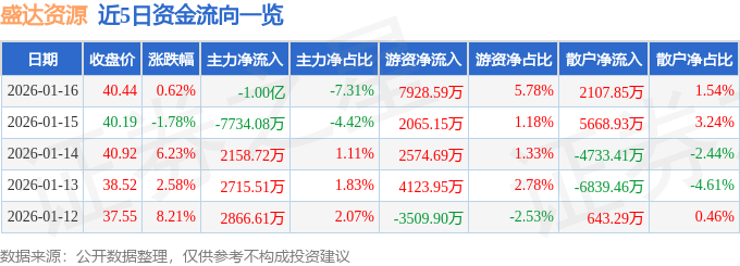 证券之星消息,截至2026年1月16日收盘,盛达资源(000603)报收于40.44元,上涨0.62%,换手率5.02%,成交量33.45万手,成交额13.73亿元。