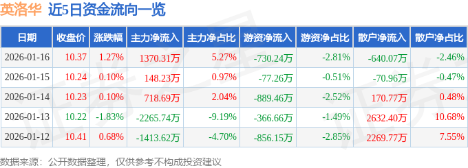 证券之星消息,截至2026年1月16日收盘,英洛华(000795)报收于10.37元,上涨1.27%,换手率2.22%,成交量25.19万手,成交额2.6亿元。
