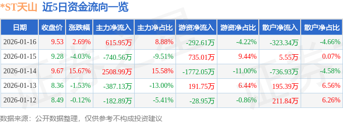证券之星消息,截至2026年1月16日收盘,*ST天山(300313)报收于9.53元,上涨2.69%,换手率3.7%,成交量7.31万手,成交额6937.06万元。