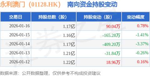 证券之星消息,1月16日南向资金增持90.04万股永利澳门(01128.HK)。近5个交易日中,获南向资金减持的有3天,累计净减持497.32万股。近20个交易日中,获南向资金减持的有8天,累计净减持370.92万股。截至目前,南向资金持有永利澳门(01128.HK)1.17亿股,占公司已发行普通股的2.21%。