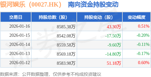 证券之星消息,1月16日南向资金增持43.3万股银河娱乐(00027.HK)。近5个交易日中,获南向资金增持的有2天,累计净增持52.58万股。近20个交易日中,获南向资金增持的有10天,累计净增持84.11万股。截至目前,南向资金持有银河娱乐(00027.HK)8585.38万股,占公司已发行普通股的1.95%。