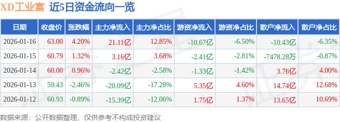 证券之星消息,截至2026年1月16日收盘,XD工业富(601138)报收于63.0元,上涨4.2%,换手率1.32%,成交量262.6万手,成交额164.2亿元。