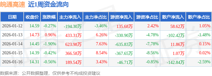 证券之星消息,截至2026年1月16日收盘,皖通高速(600012)报收于14.31元,较上周的14.63元下跌2.19%。本周,皖通高速1月13日盘中最高价报14.82元。1月16日盘中最低价报14.16元。皖通高速当前最新总市值244.5亿元,在铁路公路板块市值排名6/33,在两市A股市值排名871/5183。