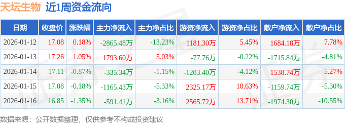 证券之星消息,截至2026年1月16日收盘,天坛生物(600161)报收于16.85元,较上周的17.05元下跌1.17%。本周,天坛生物1月13日盘中最高价报17.58元。1月16日盘中最低价报16.82元。天坛生物当前最新总市值333.19亿元,在生物制品板块市值排名9/51,在两市A股市值排名627/5183。