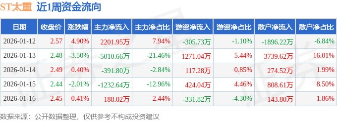 资金流向数据方面,本周ST太重主力资金合计净流出4245.14万元,游资资金合计净流入1174.8万元,散户资金合计净流入3070.34万元。本周资金流向一览见下表: