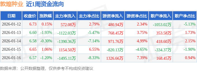 资金流向数据方面,本周敦煌种业主力资金合计净流出2280.92万元,游资资金合计净流入2727.68万元,散户资金合计净流出446.76万元。本周资金流向一览见下表: