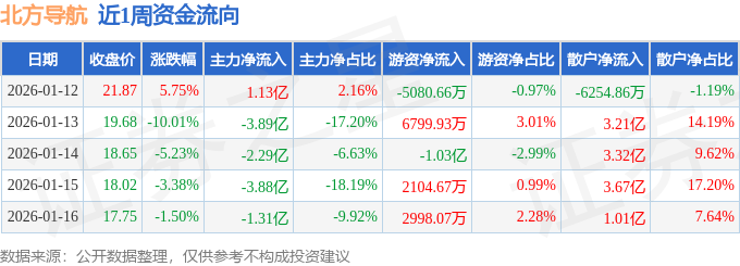 资金流向数据方面,本周北方导航主力资金合计净流出10.22亿元,游资资金合计净流出3507.01万元,散户资金合计净流入10.57亿元。本周资金流向一览见下表: