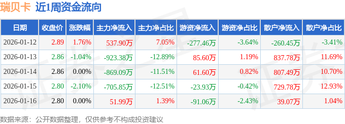 资金流向数据方面,本周瑞贝卡主力资金合计净流出1908.43万元,游资资金合计净流出245.24万元,散户资金合计净流入2153.67万元。本周资金流向一览见下表: