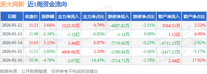 资金流向数据方面,本周浙大网新主力资金合计净流出1.15亿元,游资资金合计净流出1.85亿元,散户资金合计净流入3.01亿元。本周资金流向一览见下表: