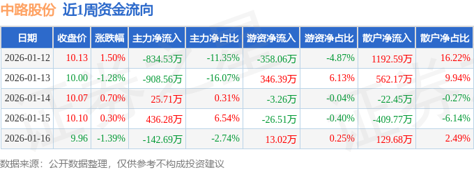 资金流向数据方面,本周中路股份主力资金合计净流出1423.81万元,游资资金合计净流出28.41万元,散户资金合计净流入1452.22万元。本周资金流向一览见下表: