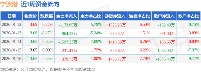 资金流向数据方面,本周宁波港主力资金合计净流出3124.26万元,游资资金合计净流入5329.49万元,散户资金合计净流出2205.23万元。本周资金流向一览见下表: