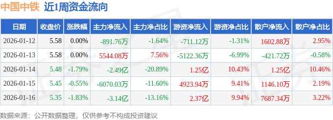 沪深股通持股方面,截止2026年1月16日收盘,中国中铁沪股通持股数为5.99亿股,占流通股比为293.0%。