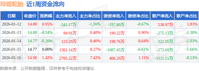 沪深股通持股方面,截止2026年1月16日收盘,玲珑轮胎沪股通持股数为2835.42万股,占流通股比为192.0%。