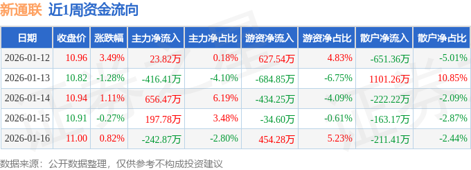 资金流向数据方面,本周新通联主力资金合计净流入218.79万元,游资资金合计净流出71.89万元,散户资金合计净流出146.9万元。本周资金流向一览见下表: