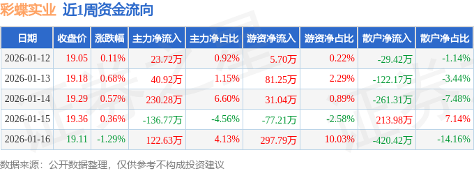 资金流向数据方面,本周彩蝶实业主力资金合计净流入280.78万元,游资资金合计净流入338.57万元,散户资金合计净流出619.34万元。本周资金流向一览见下表: