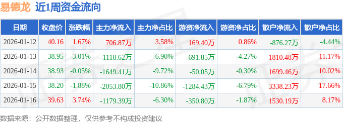 资金流向数据方面,本周易德龙主力资金合计净流出5294.35万元,游资资金合计净流出2207.74万元,散户资金合计净流入7502.09万元。本周资金流向一览见下表: