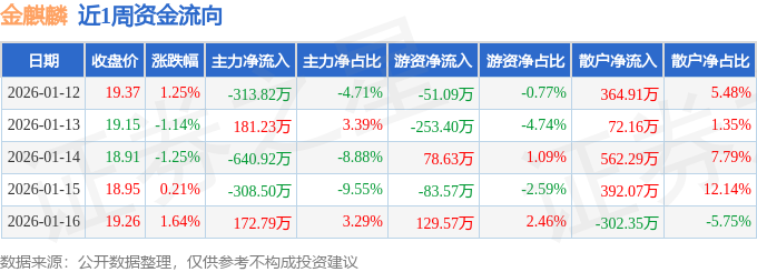 资金流向数据方面,本周金麒麟主力资金合计净流出909.22万元,游资资金合计净流出179.86万元,散户资金合计净流入1089.08万元。本周资金流向一览见下表: