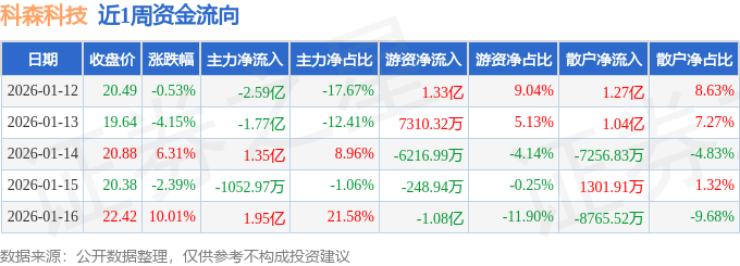 资金流向数据方面,本周科森科技主力资金合计净流出1.16亿元,游资资金合计净流入3313.57万元,散户资金合计净流入8302.55万元。本周资金流向一览见下表: